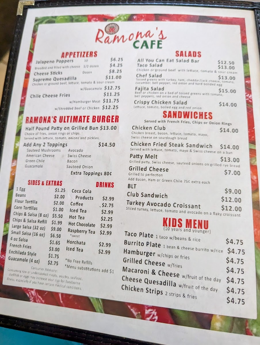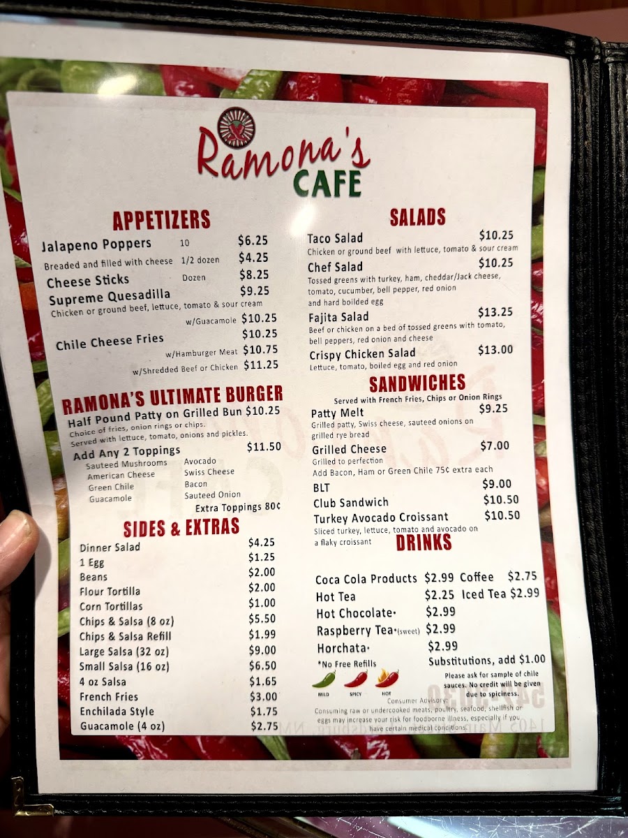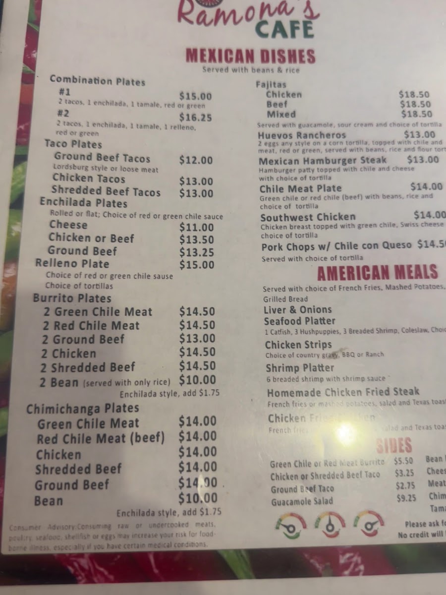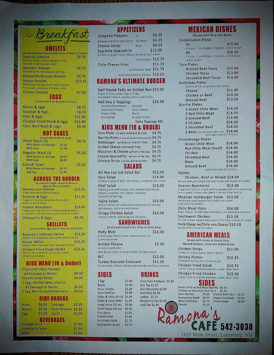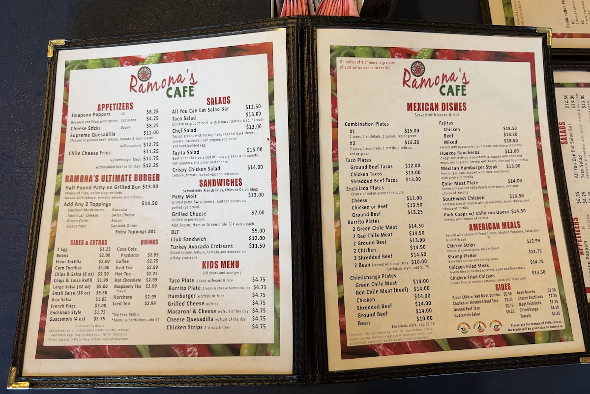 Ramona’s Cafe offers a straightforward and comforting menu that blends classic Mexican dishes with familiar café favorites. The selection features hearty plates like enchiladas, chimichangas, and smothered green chile burritos alongside lighter options such as fajita salads and fresh-made tacos. Whether stopping by for a casual lunch or a relaxed dinner, guests will find dishes that feel both satisfying and approachable.