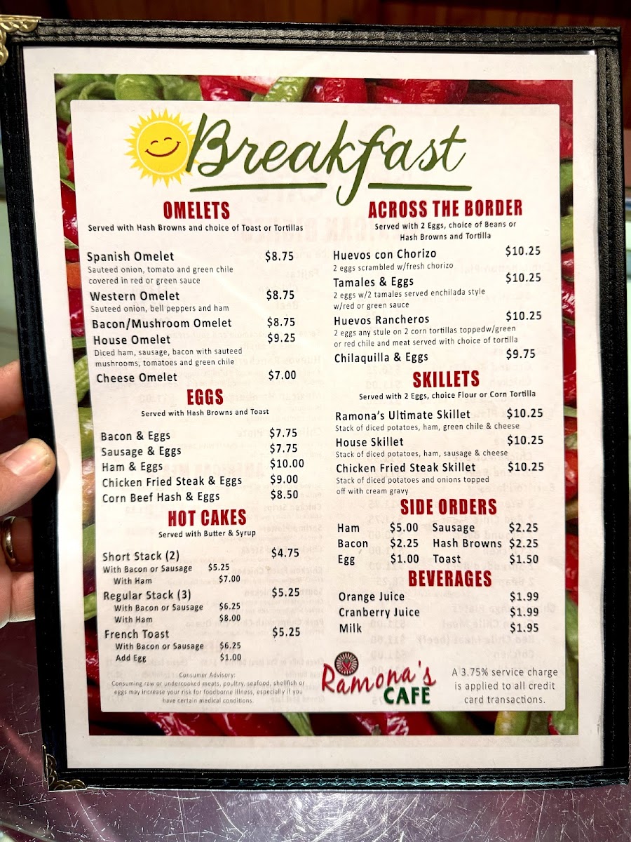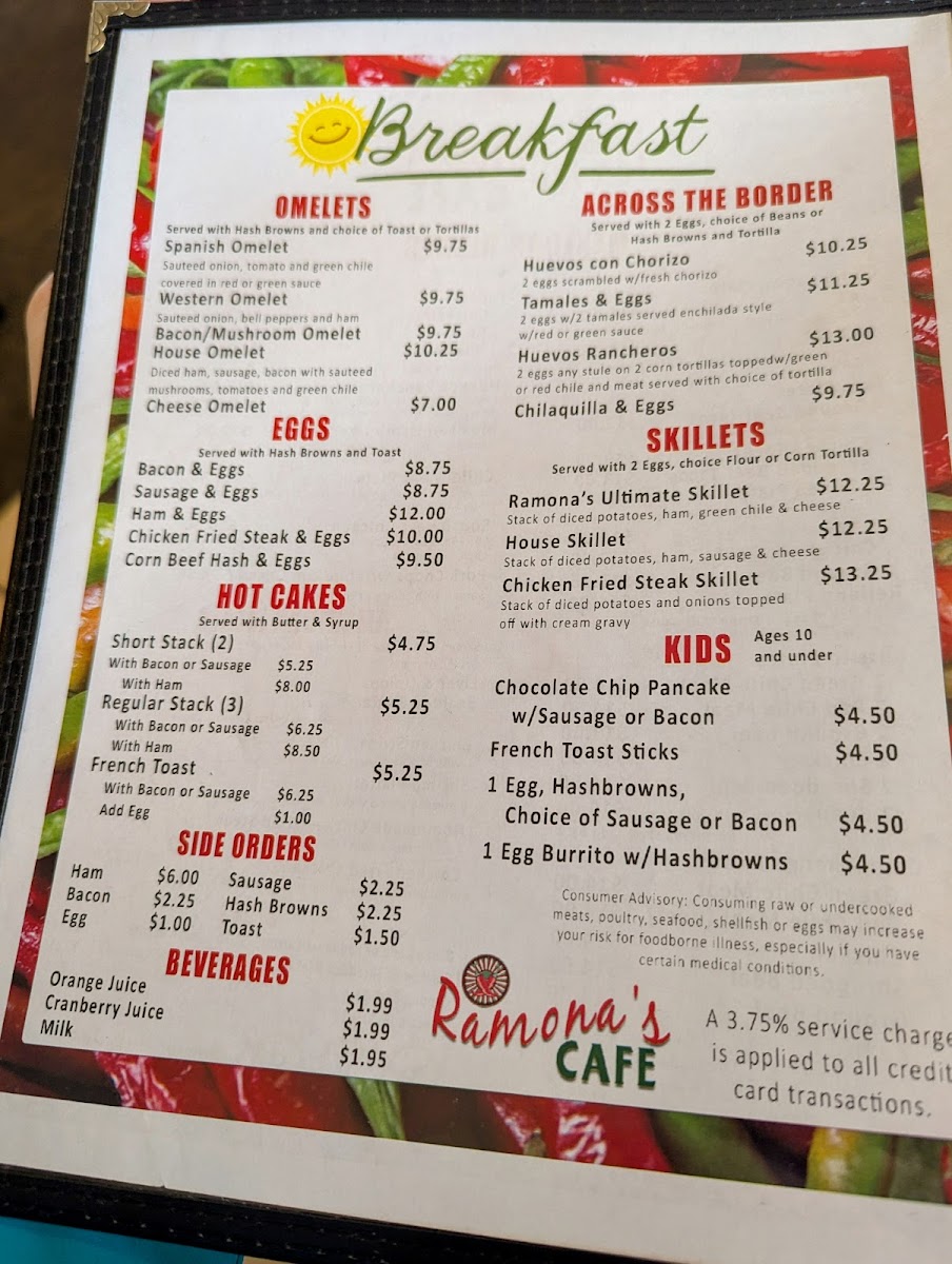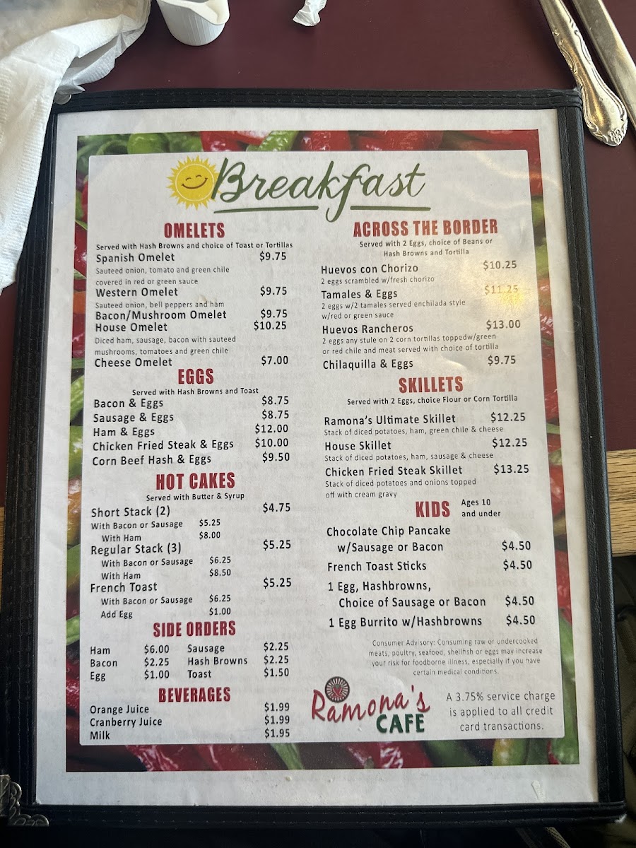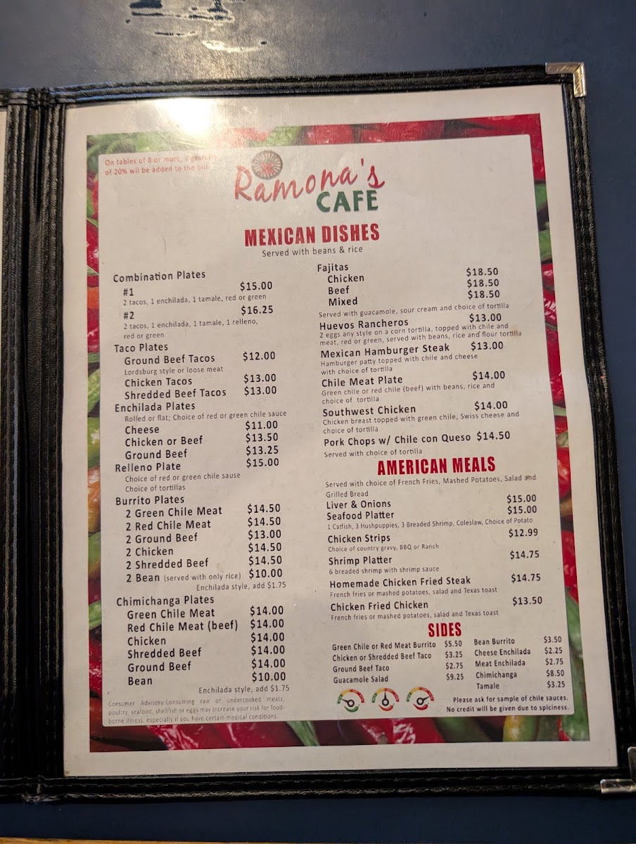 Ramona’s Cafe offers a straightforward and comforting menu that blends classic Mexican dishes with familiar café favorites. The selection features hearty plates like enchiladas, chimichangas, and smothered green chile burritos alongside lighter options such as fajita salads and fresh-made tacos. Whether stopping by for a casual lunch or a relaxed dinner, guests will find dishes that feel both satisfying and approachable.